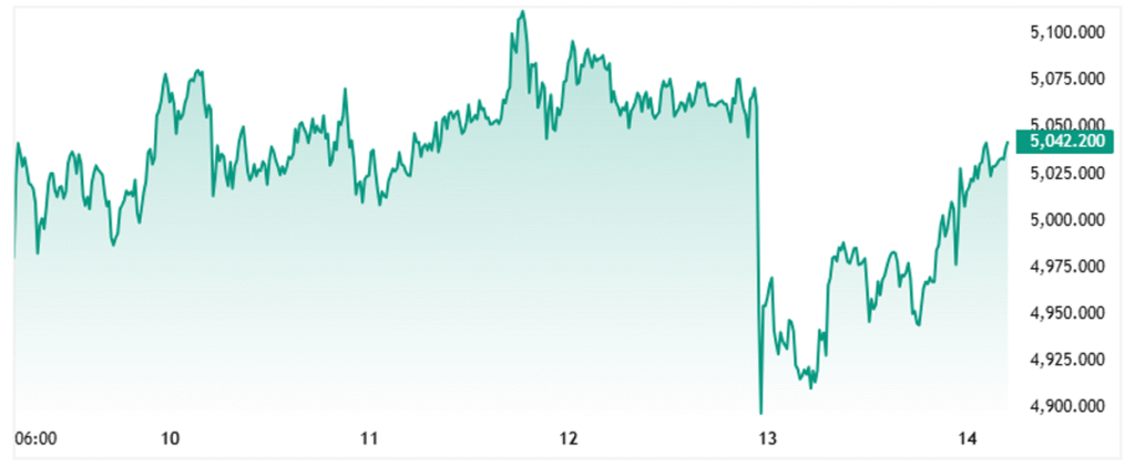 Ngay sau đó, vàng lại hồi phục theo đúng “chất” của thị trường biến động cao: đến khoảng 12:30, giá đã lên lại 4.970 và tiếp tục giành lại 5.000 trước khi thị trường cổ phiếu Mỹ mở cửa sáng thứ Sáu. Kết tuần, vàng đóng quanh vùng trên 5.000 khoảng 40 USD, và tiếp tục co hẹp dao động trong biên chặt.