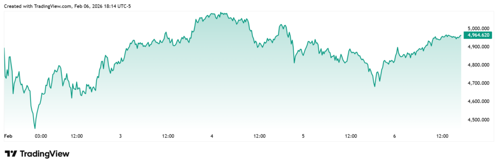 Tuy nhiên, khi giá tiến gần vùng cao, lực bán quay trở lại. Thị trường ghi nhận các nhịp kiểm định hỗ trợ quanh 4.900 USD/oz và những lần nỗ lực giành lại mốc 5.000 USD/oz, trước khi kết tuần trong trạng thái “bình thường” hơn: tăng nhưng không dựng đứng, đóng cửa cách mốc 5.000 USD/oz không xa.
