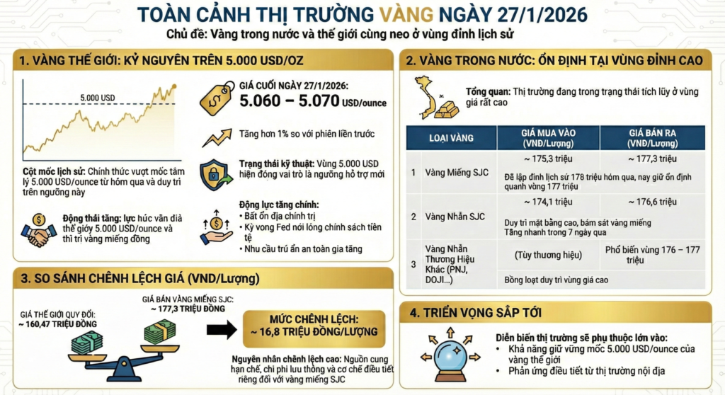 Trên thị trường quốc tế, giá vàng thế giới cuối ngày 27/1/2026 được ghi nhận quanh 5.060 – 5.070 USD/ounce, tăng hơn 1% so với phiên liền trước. Đáng chú ý, mốc 5.000 USD/ounce – vùng kháng cự tâm lý cực mạnh – đã bị chinh phục từ hôm qua và hiện đóng vai trò là ngưỡng hỗ trợ mới.